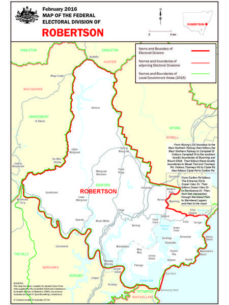 Robertson covers an area from the Hawkesbury River and Broken Bay in the south, west to Gunderman, north along the Gosford City Council Boundary to Kulnura, then east and south along the Gosford City Council boundary until it crosses the main Northern Railway Line at Lisarow. South along the main Northern Railway line to North Gosford, then east along Glennie Street, Clyde Road, Carlton Road, The Entrance Road, Ocean View Drive and Wamberal Lagoon inlet to the coast. The main towns include Erina, Gosford, Gunderman, Kulnura, Mooney Mooney, Narara, Patonga, Somersby, Terrigal and Woy Woy.